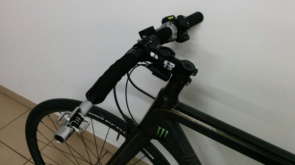 A force de rouler quasiment plus que sur la route, je suis passé d’un Quick CX Cannondale super polyvalent à un vélo consacré qu’à la route, un CAAD10 de la même marque. Toujours avec le même aménagement au niveau du guidon et de la selle sauf que cette fois-ci avec le changement de vitesse avec le système Di2 qui me permet d’avoir les commandes pour les plateaux en plus.